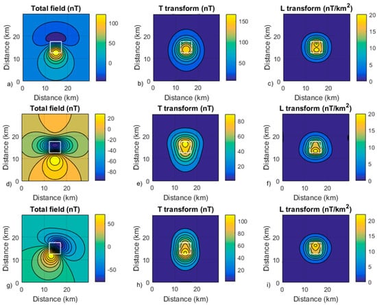 We refer readers to the original paper by Stavrev and Gerovska [] for an in-depth analysis of the properties of these transforms. In Figure 2, we show, in practice, what the effects of the transformation of the total field into T or L fields are. To this aim, we computed the total field of a square-based prismatic source with 5 km long sides, at a depth to the top of 2.5 km and a thickness of 12.5 km (we used the formulas presented in []). In (a), the total source magnetization is parallel to a geomagnetic field with a declination of 0° and inclination of 50° (mid-latitude case). The total field (Figure 2a) shows a dipolar form, with a complex relationship between the anomaly and the source positions. Notably, the magnetic anomaly extends over practically all the sampled area. The anomalous magnetic intensity T (Figure 2b; Equation (1)) instead presents a single maximum, almost perfectly positioned above the source. The area interested by the T anomaly is smaller than that of the corresponding total field anomaly (Figure 2a). This suggests that in real applications, the T field should be less affected by interference from the magnetic effects of nearby sources than the original total field. The Laplacian of T (i.e., the L-transform, Equation (2)) implies a second-order differentiation process, with an amplification of the high-wavenumber part of the spectrum. The L field has a maximum which is very well centered above the source. Furthermore, differently from the total field or the T transform (Figure 2a,b), the contours of L-transform (Figure 2c) do not have a round shape, their shape providing some information about the true source shape. These features, as well as the reduced horizontal extension of the L anomaly, demonstrate the effect of the increase in resolution compared with the original total field anomaly. These general features of the T- and L-transformed anomalies can also be seen in the low-latitude case (Figure 2d–f) and when there is a strong component of remanent magnetization (Figure 2g–i), confirming that these transforms are very stable with respect to the source magnetization direction [].