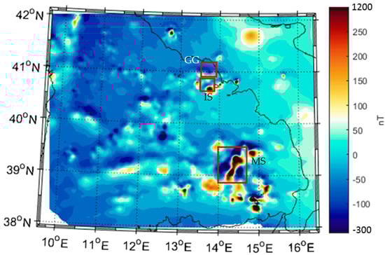Total field aeromagnetic map of the Tyrrhenian Sea relative to the altitude of 1463 m above sea level. Red boxes marked IS, GG, and MS locate the areas analyzed in detail in Section 4.2 (W offshore of Ischia Island), Section 4.3 (Gaeta Gulf), and Section 4.4 (Marsili Seamount), respectively.