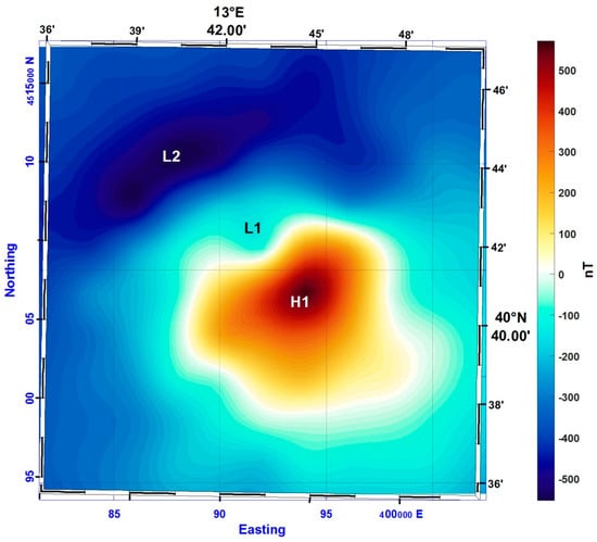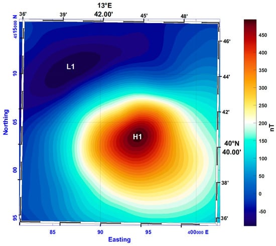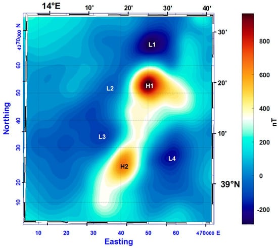 An intense dipolar anomaly (more than 1200 nT at sea level) is located on the southern flank of a bathymetric northeast–southwest ridge (H1 and L1 in Figure 4). Another southwest–northeast elongated anomaly is present in the westernmost area (H2 and L2 in Figure 4), having an anomalously intense and extended low area, exhibiting the presence of an intrusion with a probable large remanent component in the total magnetization. Moreover, this anomaly does not correlate with any seafloor feature, that in this area, is relatively flat. Northeastward, several small anomalies form a rather complex pattern, probably due to the coalescence of highs and lows of anomalies caused by small and shallow body sources very close to each other.