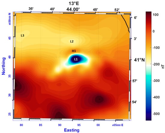 The shipborne magnetic anomaly map shows a sharp anomaly with reversed polarity (H1–L1 in Figure 8). This anomaly was interpreted as a high susceptibility east–west elongated volcanic edifice, with a high remanent magnetization component along a direction opposite from that of the present inducing field []. It is interesting to notice that this reversed anomaly is hard to identify in the aeromagnetic data, because it lies in an area where many magnetic lows develop (L2 and L3 in Figure 8), related to normally magnetized buried sources emplaced further south.