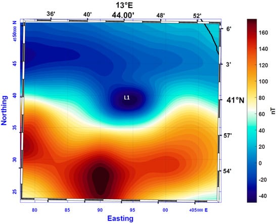 In fact, the case of the anomaly of the Gaeta Gulf well shows the loss of information and the ambiguity of interpretation due to the high measurement altitude of an aeromagnetic survey. The map of the aeromagnetic field (Figure 9) shows only a single magnetic low (L1 in Figure 9) in the investigated area, whereas there is no evidence of the small and weak magnetic high visible northward in the shipborne data map (H1 in Figure 8). In this case, the low resolution and the great distance from the causative source affect the correct representation of the shape of the anomaly, concealing an essential attribute such as its dipolar character. This can compromise any attempt of analysis, thus causing misleading interpretations.
