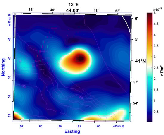 A high-resolution shipborne magnetometric survey was carried out in the area of the Marsili Seamount (located in the box MS in Figure 3) during 2006 []. Data were collected with a Cesium magnetometer along east-southeast–west-northwest track lines, with the spacing gradually decreasing from 15 km to 3 km toward the central area of the seamount. The grid of the total magnetic field over the MS area has a cell size of 500 × 500 m2 []. The total field anomalies (Figure 12) show a series of highs along the seamount crest and deep lows in the northwest area. Other magnetic lows are present to the north and to southeast of the seamount. The geodynamical context, in a young back-arc basin, the elongated shape of the seamount and its overall dimensions lead several authors to interpret the magnetic anomalies in the MS basin as an expression of the oceanized floor expansion, with the presence of bands of crust magnetized with alternating polarity []. The analysis of aeromagnetic data and of its anomalous magnetic intensity [] demonstrated the diffuse presence of reverse-magnetized rocks in the MS basin, although they could not confirm the presence of a well-organized striped pattern of magnetic anomalies. However, the analysis of the higher-resolution shipborne magnetic dataset of Figure 12 highlighted the presence of subtle, low-amplitude, elongated highs developing symmetrically to the MS axis, in its northern part []. These symmetric magnetic highs were interpreted as generated by magnetized structures at the base of the volcanic edifice dating back to Jaramillo subchron (about 1 million years ago), marking the transition from lateral spreading to a phase with prevailing vertical growth of the seamount [].
