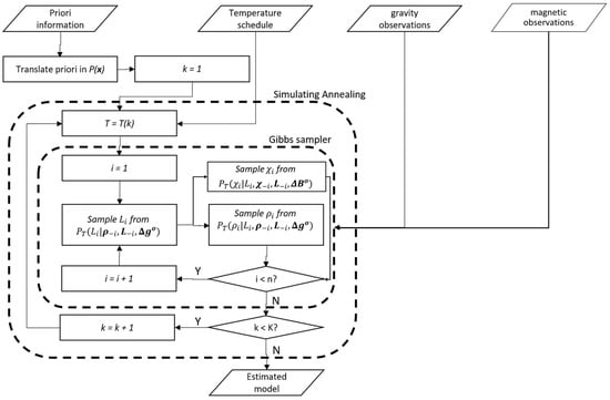 Therefore, the three-dimensional joint probability of label density and susceptibility shown in Equation (14) can be sampled by first drawing a sample from the label marginal distribution and then, according to the extracted label value, from the density and susceptibility conditional ones and . This procedure can be repeated iteratively for all the voxels, updating each time the previous parameters realisation. Once all the voxels are updated, the temperature is slowly decreased and a new stage of the Gibbs sampler is started again, as shown in the flow chart of Figure 1.