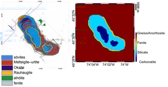Detailed geological model of Oka Carbonatite complex from [29,33] (left) and simplified geological model used to build the a-priori model (right).