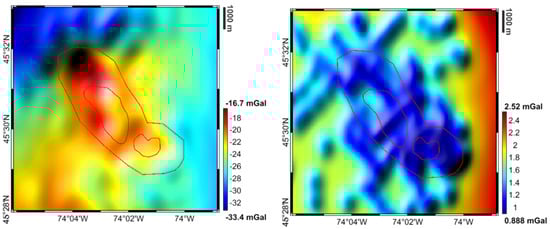 Gravity and magnetic data were downloaded from the Natural Resources of Canada webpage [34]. In detail, considering gravity observations, we started from a set of point-wise ground Bouguer anomalies (corrected with a density value of 2670 kg/m), derived from several surveys and with accuracy ranging between and 5 mGal. We build a complete grid on the study area with a spatial resolution of 100 m × 100 m, together with its predicted accuracy (see Figure 3) by exploiting a least square collocation procedure (details can be found in [35]).
