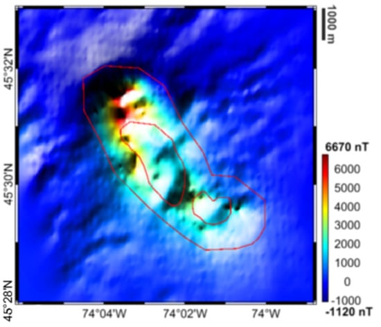 The Monteregian Igneous Province (MIP) is a large area in the south of Québec, Canada, which consists of nine alkaline intrusions and dikes arranged in an approximately east–west direction, starting 60 km west of Montreal, across St. Lawrence Lowland. Its characteristic quasi-linear trend suggests that the pluton positioning was controlled by a deep-seated fault [29]. Starting from the Easternmost intrusion, there is a progressive change from an area with an abundance of felsic rocks and quartz-satured rocks towards more westerly carbonatites complex with silica-undersaturated rocks, while content of Fe increase from west to east [29]. These differences in silica content between complexes arose because of the different periods of rock emplacements, occurring in two different magmatic events, from 117 to 141 Ma, and in response to an upward transport of a metasomatic fluids in mantle [30]. The Oka pluton is the westernmost and youngest complex in the entire MIP. The intersection of two different tectonic lineaments, the northwest trending Beauharnois arch and eastward trending faults associated with the Ottawa-Bonnechere graben, is thought to have constrained the emplacement of the complex [31]. Pluton is a bean-shaped body, composed in the central part by both carbonatite and Si-undersaturated rocks such as okaite, ijoite, alnoite, and jacupirangite [32], boarded by strongly metasomatized rocks (feniti), as usual with carbonatites bodies, and intruded in a Precambrian gneiss an anorthosites ground. Oka carbonatite are mainly a coarse-grained calcite-carbonatite, which under these conditions are called sovite. It is composed of a high percentage of calcite, and other accessories minerals such as apatite, biotite, wollastonite, magnetite, and pyrochlore. Presence of pyrochlore is very relevant as it is the main mineral from which Niobium is extracted. Mining activity, in fact, was carried out in the past in this area. Okaite is composed by a large volume of melilite, and a minor amount of apatite, biotite, perovskite, and magnetite. Ijolite includes a wide variety of mafic rocks and is composed essentially by nepheline and pyroxenes, while jacupirangite is made up of a great percentage of fassaite (a variety of augite, pyroxene) and other small percentages of nepheline and magnetite [32]. Carbonatite rocks and Okaite have the largest percentages of magnetite in their composition, so we imagine they are the most magnetized rocks in the complex. Jacupirangite is the rock with the major density, while for the carbonatite system, densities go from 2840 kg/m for sovite, which forms the biggest part of the complex, to 3410 kg/m for the magnetite-carbonatite [28].