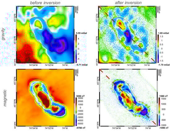 Residuals before (left) and after (right) applying the joint inversion for the gravity (up) and magnetic (down) fields. Red lines represents the boundaries of main units of the Oka complex. Red dashed line is the profile shown in Figure 9.