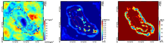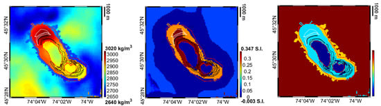 What we can observe is that the inversion has been able to noticeably reduce the misfit with respect to the observed fields from mGal and 1130 nT of the a-priori model to mGal and 210 nT of the final solution. Focusing on the gravity residuals, we see that the residuals of the a-priori model are dominated by high negative values, close to the southernmost limit of the Oka formation and by a general southwest–northwest trend. These main characteristics have been properly corrected in the final results, which just shows two small anomalies, opposite in sign, in correspondence of the core and in the northern part of the carbonanite complex. In any case, we can see, comparing Figure 3 and Figure 5, that the obtained residuals are compatible with the predicted accuracy, namely, they are always smaller than the three times the standard deviation reported in the accuracy map.
