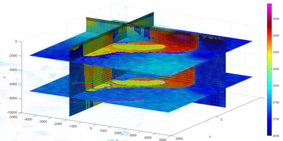 We can notice in both the maps the presence of well-defined sharp variations in the specific property at the boundary of different geological units. Looking to the density maps, we can also see high density values (of about 3000 kg/m) in the northern part of the complex that can be associated to the presence of the okaite series while, when moving south, lower density values around 2900 kg/m are found in correspondence of the melteigite-urtite series. This corresponds well to the detailed geological maps and to our knowledge of the detailed geological formations retrieved from tje literature (which foresees densities of 2970 kg/m and 2880 kg/m; see [27]). The estimated sovite density is of about 2860 kg/m, which is again well-aligned with the literature (see, e.g., [39]). Looking to the susceptibility map, we can observe how the inversion predicts significant susceptibility only in the silicate rocks with values radially decreasing from the core of the anomaly. Figure 7 shows some slices of the full 3D density model.