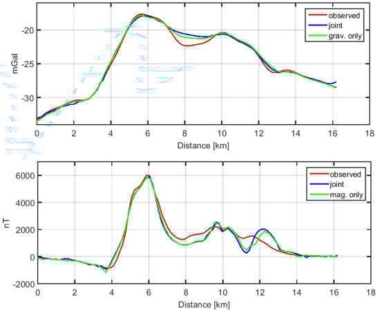 The developed software allows to perform also gravity-only or magnetic-only inversions, by considering only the corresponding terms in the objective function (Equation (10)). We report in Figure 9 the gravity and magnetic signals along the profile shown in Figure 5 for the gravity-only, magnetic-only and joint inversions.