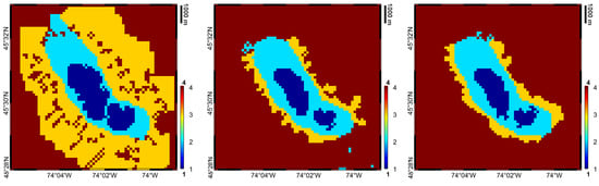 Estimated labels at 1.5 km from gravity-only inversion (left), magnetic-only inversion (centre) and joint inversion (right).