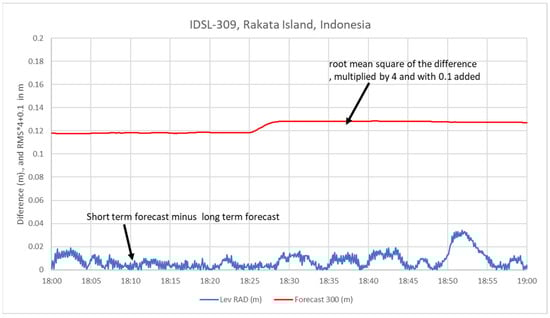 The primary goal of tsunami detection in the continuous flow of sea level data, with one data sample every few seconds in the best case, is to differentiate and identify the signal (tsunami) from the noise (all sea level changes that are not due to a tsunami). This is achieved through the estimation at each new data acquisition of the absolute difference between the long-term forecast (LTF) and the short-term forecast (STF), one of the most broadly used algorithms in weak-motion seismology []. The LTF is an estimation of the value of the current point, performed by calculating the least square second-order polynomial related to a long period (1.5–3 h of data), whereas the STF is the same quantity estimated using a shorter time window (10–20 min). Therefore, the difference tends to identify changes in sea level due to tsunamis with a specific period range without being confused by individual outliers (i.e., a sudden individual value in the normal values). However, for very noisy signals, the change could be due to an increase in noise. Therefore, in order to identify a point as an alert, we compare the absolute difference between LTF and STF with the root mean square (RMS) of the signal: when the difference exceeds a number of times, the RMS the alert level increases by 1 unit, and when it comes back below the threshold, the alert level decreases by 1 unit. The maximum value of the alert level is 10.