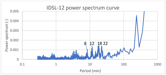 Le Castella, Italy, is a much smaller port than Saidia Marina and the signal (Figure 8) is characterized by a power spectrum with four typical oscillations of periods 8, 12, 18 and 22 minutes with smaller amplitudes than in the case of Saidia Marina (Figure 9). Using a similar approach as in the case of Saidia Marina and considering 12 min as the characteristic period, we limited the long-term average period to 48–60 min and therefore the number of points, with a 6 s interval, to 480–600 points maximum.