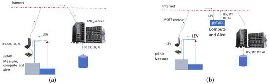 Different implementation of the algorithm computation schemes. (a) IDSL scheme: measurements, calculations and alerts performed on site; (b) generic sea level with push capability: calculations and alerting performed at the receiving server.