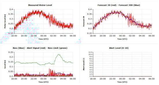 The reason for using both the RMS and the threshold in (1) is that when a signal is very noisy, it is important that the signal overpasses the normal oscillations to avoid the generation of an alert for each oscillation. On the other hand, a threshold is still necessary in order to avoid that the other extreme, where a very smooth signal with very small oscillations, even in the range of 1 mm, generates an alert. In short, both the RMS with its multiplier and the threshold value should be considered. The values we found to be reasonable as starting values are 4 as the RMS multiplier and 0.1 m as the threshold; however, this parameter should be calibrated after the operation of the instrument for some time.