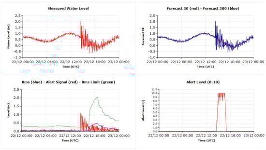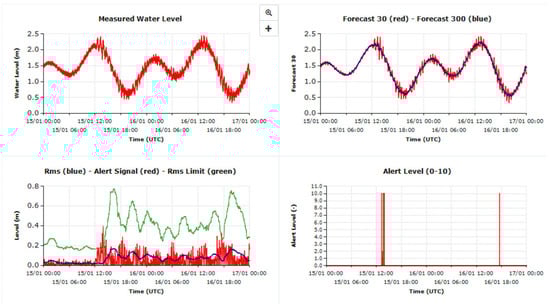 The quality of the recorded sea level data plays a significant role in the successful performance of this algorithm: in the case where a spurious peak is present in the data, if not properly excluded from the acquired data (for example by excluding points with a variation from one point to another of more than a reasonable amount), these variations are reflected in the short-term forecast and therefore also in the alerting value. This can consequently result in a false alert. To avoid such a situation, it would be ideal to have another instrument installed close by to ensure that the alert is triggered only based on both observations. Such a deployment could also prevent the activation of alerts as the result of possible disturbances due to the position—below or close to the acoustic cone below the sensor—of an object, person, boat etc.