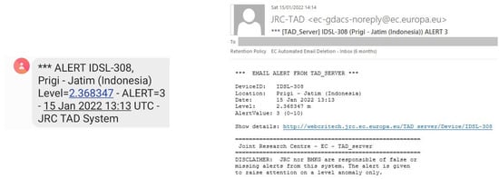 About 7 h after the explosion, the pressure wave reached IDSL-308, located in Prigi, south of Java, resulting in a sea level anomaly with a variation up to 30 cm above the tide level, as shown in Figure 14. The detection algorithm identified the event, resulting in the activation of the webcam at 13:14 UTC (20:14 local time, Figure 15) and the release of email and SMS alerts to registered users, as shown in Figure 16.