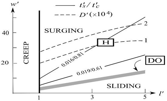 Since the thermal switch underpinning Figure 1 is generic, the limit cycle is precisely the boundary that divides the steady-sliding and cyclic-surge regimes (shaded line, marked DO). Denoting the corresponding “stream” properties by the subscript “s”, then the following surging properties are functions only of the heating parameter defined by the relative strength of the frictional to geothermal heating (Appendix A) to be given by: