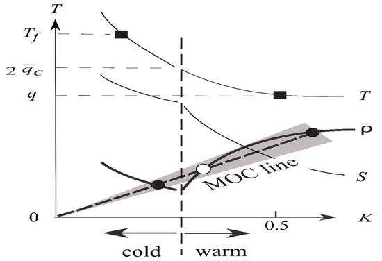As regards the MOC line, it is straight because of the assumed linear dependence of MOC on the density surplus [45,46]. The proportional constant is coined “admittance” drawing its analogy from electrostatics with density/MOC playing the role of voltage/current, whose inverse sets the slope of the MOC line. In primitive-equation models that do not resolve eddies, the MOC takes the form of a laminar overturning cell, and admittance is linked to the diapycnal diffusivity, which in effect is a free parameter finely tuned to yield the observed state [17]. For the example shown in the figure above, the ocean is bistable and the two equilibria (the solid ovals, where the open oval is the unrealized saddle point) are precisely those uncovered by [47] and, in support of our convective bound, their cold state is indeed characterized by a vanishing convective flux [47] (their Figure 18).