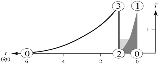 Since the last deglaciation is preceded by the H1, we choose a forcing deficit smaller than that of Figure 5 so the post-HE warmth would vault the climate into the warm branch, as illustrated in Figure 9. For this example, we have set the forcing 0.8 (that is, the absorbed SW flux is 80 below the global mean), and although the freshwater flux is greater for the YD than that that drives the H1, to avoid an unwieldy plot, a single value of 0.1 Sv [86,92] is used in this figure. For the time plot shown in Figure 10, we again assume a square-wave freshwater flux of a 2 ky period (light shading), the same as that that drives the DO cycles, which however can be augmented by meltwater pulses drawn according to their observed timing. Since deduced events resemble observed ones, they are labelled as such to aid the following discussion.