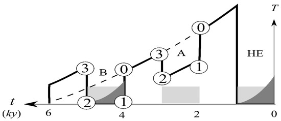 We have posited in Section 2 that the DO cycles have their origin in the quasi-periodic calving of the coastal ice from the ablation zone. Since there is ablation in the glacial time only by the post-HE warming, the glacial DO cycles are encased within the H cycle, as illustrated in Figure 7, where the outer line represents the H cycle shown in Figure 5. Following the same convention, the DO cycles go through numbered states with solid and dashed arrows indicating the fast (decadal) ocean response and the slow (millennial) MEP adjustment, respectively. The corresponding anatomy is drawn in Figure 8 for which we have applied a square-wave freshwater flux of a 2 ky period (shaded columns) [34] (their Figure 8), and the dark shading symbolizes the sea-ice cover.