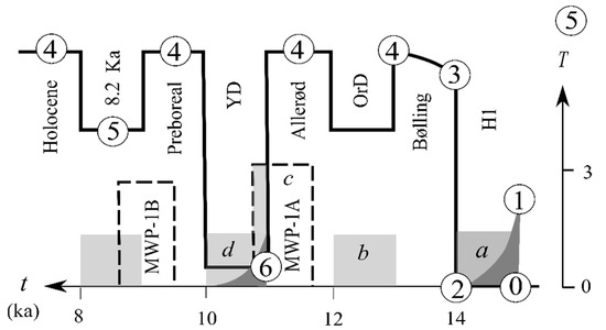 The anatomy of deglaciation corresponding to that of Figure 9 with the observed events labelled. The light shades are the square-wave freshwater flux of a 2-ky period with letters a–d corresponding to the meltwater events identified in [83]. The dark shades indicate the sea-ice covers induced by ocean cooling.