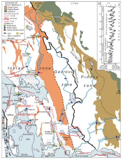 Map showing location of major rivers, sample sites, and principal geological units that are a source of siliciclastic detritus and heavy minerals, and active faults. Base geological map from [16], uncoloured areas are mostly limestone. Active faults from [3,5]. Rivers and dams from [12], Ionian Sea watershed from [17], marine isotope stage (MIS) 2 shoreline from [4,18,19]. Inset shows the Pleistocene global oceanic oxygen isotope curve and the identification of lowstand marine isotopic stages [20].