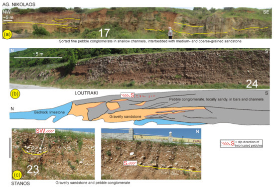 Field photographs and interpretative sketches of terrace gravels. (a) Ag. Nikolaos; (b) Loutraki; (c) Stanos. 17, 24, 23 are corresponding sample numbers, located in Figure 2. For interpretation, see text.