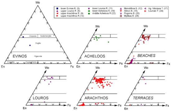 Mytikas beach has a different source for most pyroxenes based on their detailed chemistry. Fe-rich diopside is the dominant clinopyroxene, with only one similar grain at Pogonia and none in other beach samples (Figure 5). Mytikas is also the only beach with hypersthene and Ca-free enstatite completely lacking any Ca. A similar pyroxene assemblage is characteristic of the lower Louros River, and these mineral types are also found in the Arachthos River, although proportionally much less abundant compared with other pyroxenes. These distinctive minerals may be reworked out of local Ionian flysch (Figure 4). However, a single grain of olivine and a single ophiolite lithic clast at Mytikas, together with common clino- and orthopyroxene, may be first cycle from the Arachthos River, as they are proportionally more abundant in the Arachthos than in rivers such as the Acheloos and Louros with predominant second cycle sources from flysch.