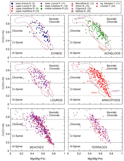 Plot of Cr/(Cr + Al) vs. Mg/(Mg + Fe) showing chemical variation in chromite and spinel. Dashed lines in plots for river samples show the distribution limits in the Ag. Nikolaos and Loutraki terrace samples.