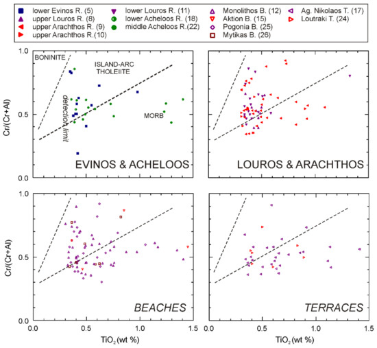 Chromite and spinel are shown on a plot of Cr/(Cr + Al) vs. Mg/(Mg + Fe) (Figure 7). All localities show a cluster with Mg/(Mg + Fe) = 0.35–0.75 and Cr/(Cr + Al) = 0.20–0.85. The Arachthos River is distinctive in having a higher proportion of grains beyond this main cluster, with many grains with Cr/(Cr + Al) = 0.19–0.40 and some grains with Cr/(Cr + Al) = 0.85–0.98. The Monolithos, Aktion and Pogonia beaches and the Ag. Nikolaos terrace all show similar features to the Arachthos River, whereas the Loutraki terrace appears similar to the Acheloos River in its chromite and spinel compositional range. Chromite and spinel from Mytikas beach sand most closely resemble the Louros River samples. Some chromite and spinel analyses have TiO2 contents above the detection limit of ~0.4% (Figure 8). Samples with common spinel with TiO2 >1.0% are from the Acheloos River, Monolithos beach and Loutraki terrace.