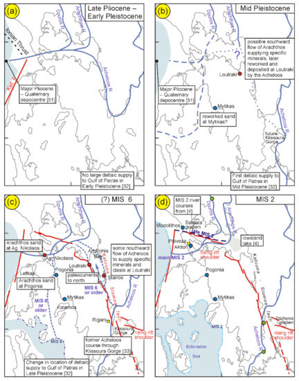 Maps showing inferred evolution of the drainage system through the Quaternary, based on our heavy mineral studies and supplementary information from [4,32,33,51]. Paleoshorelines in Echinadon Sea from [19], Katouna–Stamna fault zone from [3].