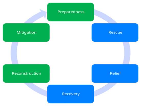 Many disaster management organizations follow a structured framework called the disaster management cycle (DMC) when preparing for and responding to hazardous events [1,2,3,4]. This cycle consists of six phases, as illustrated in Figure 1. Pre-disaster and intra-disaster phases are reconstruction, mitigation and preparedness, which range from months to years in duration [1,3,4]. Post-disaster phases are rescue, relief and recovery, which range from minutes to days in duration. Detailed and timely information about the status of critical infrastructure is of utmost importance during these stages [1,4].