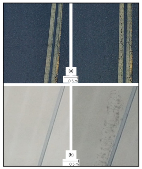 Examples of damage simulation in baseline (left images, (a) and (b)) and time-n (right images, (a) and (b)) pairs. Removal of cracks in baseline images is shown (a) and addition of cracks to time-n images is shown (b).