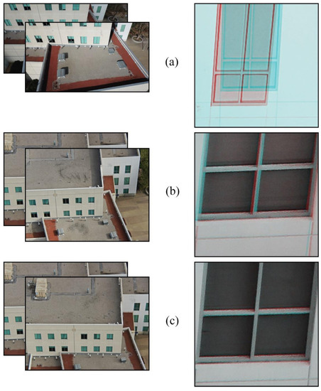 Acquisition of sUAS imagery is typically achieved using parallel overlapping flight lines, with a frame-based sensor designed to capture images based upon either time or distance intervals [15] that provide sufficient forward-lap and side-lap to ensure features are viewed from multiple perspectives (i.e., parallax). While differential parallax between multiple images of the same features permits aerial triangulation, it makes co-registration between repetitive imaging of the same area or features challenging [16,17]. Parallax introduces variable relief displacement between multi-temporal images [18]. The distortions in vertical features and co-registration errors between time-sequential images, resulting from varied view geometries, reduces the accuracy of image registration and therefore changes detection results [16,17,19].