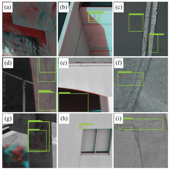 Examples of damage detection, where the green boxes indicate the models detected damage. (a) through (c) were generated with the Mavic 1 non-RSI images and model, (d) through (f) were generated with the Matrice 300 non-RSI images and model, and (g) through (i) were generated with the Matrice 300 RSI images and model. (a) bridge, damage missed, (b) building, 1 of 2 damage instances detected, (c) road, both instances of damage detected, (d) bridge, 1 instance of damage detected, 1 false-positive detection, (e) building, damage detected, (f) road, damage detected, (g) bridge, damage detected, (h) building, damage detected, (i) road, damage detected.