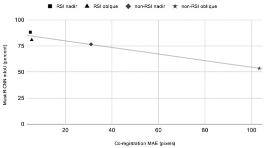 A plot showing the relationship between the nadir and oblique RSI and non-RSI Mask R-CNN mIoU results, against their associated image co-registration MAE values, is shown in Figure 7. From this, an inverse linear trend is evident, such that the Mask R-CNN detections were more accurate when the co-registration error was lower.