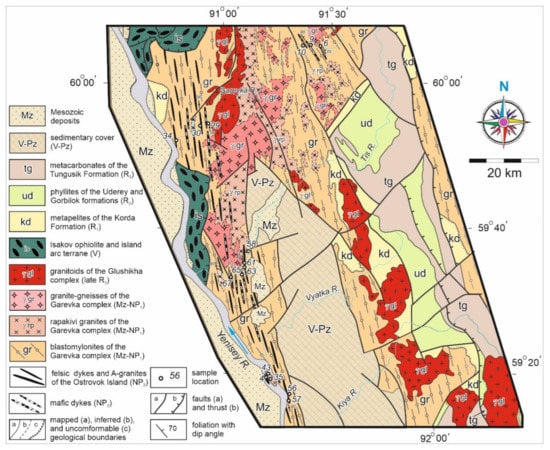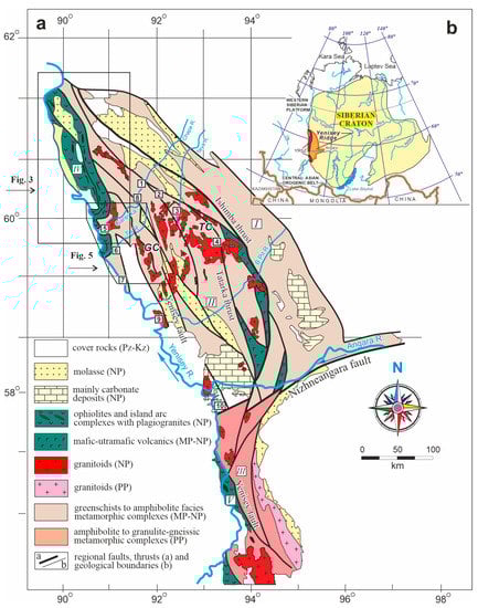 For a detailed review of the geochronology, tectonic setting, and geodynamic history of the various complexes in this region, including a summary of the chronological sequence of the main stages and events in the Yenisey Ridge, we refer our readers to a review paper by Likhanov et al. [56].