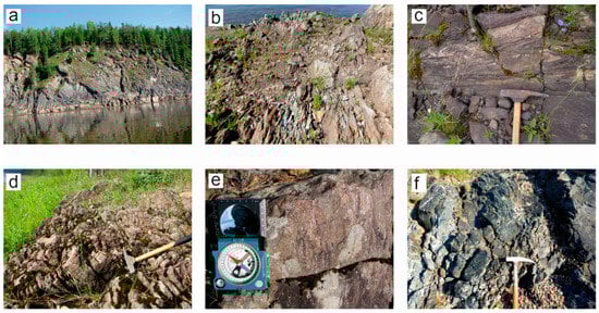 (a) Field photos of rock outcrops, (b) shear zones of intense deformations, (c) strike-sleep displacement with the vertical orientation of the fold axis, (d) coarse foliation, (e) fine schistosity with the development of linear gneissosity and metamorphic banding, and (f) typical rocks for metabasite tectonites of the Transangarian region of the Yenisey Ridge.