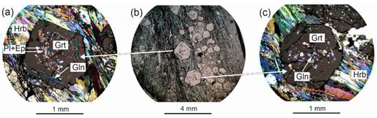 Rock structures and textures of the tectonites of YRSZ indicated by the segregation redistribution of the material under the conditions of the regional shear: (a,c) relic inclusions of glaucophane, albite, phengite, and epidote in porphyroblasts of garnet, crossed nicols; (b) late segregation isolations of lenticular-banded morphology are essentially garnet-amphibole aggregates, parallel nicols.