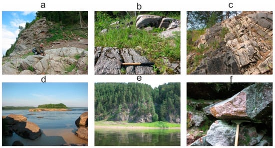 Field photos of rock outcrops: (a) the Nemtikha Group plagiogneiss granite rocks, (b) Malaya Garevka Group rapakivi-type granites, (c) the dyke localities exposed along the Yenisey bank, (d) granitoids of the Ostrovok island, and (e,f) granites of Chernorechensky massif.