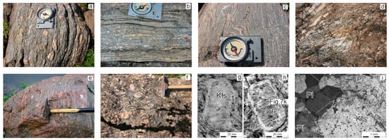 8. Metamorphosed rapakivi-type Bt granites occur as small boudinaged pods and bodies within migmatized gneisses with porphyroblasts of microclinized orthoclase (Figure 7f). They are characterized by well-preserved primary mineral compositions, Carlsbad twinned orthoclase megacrysts (Figure 7g,h), marginal structure (Figure 7k), and indistinct magmatic foliation.