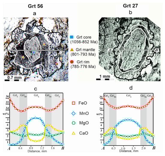 Photomicrographs of samples 56 (a) and 27 (b) showing texture features developed within garnets from pelitic gneisses and schists in the Garevka Complex. Compositional profile across a zoned garnet porphyroblasts (sample 56–(c), sample 27–(d)) with three growth zones is indicated by the light line A–B. Compositionally distinct zones of garnet are indicated by white (core-Grtc), and different shades of grey (mantle-Grtm and rim-Grtr). The locations of dated samples (sample 56–(a)) are given with the age of the dated grain corresponding to the symbol that they are represented by.
