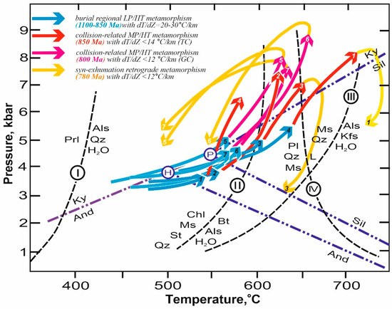 In all the studied examples, Neoproterozoic Ky–Sil medium-pressure metamorphism was overprinted on regionally metamorphosed low-pressure andalusite-bearing rocks [47]. Zonal low-pressure LP/HT metamorphic complexes (P = 3.9–5.1 kbar, T = 510–640 °C) of the andalusite–sillimanite type were produced at a metamorphic field gradient typical of orogenesis: dT/dZ = 25–35 °C/km (Figure 9). In the rock succession of Ky–Sil metamorphism of the Teya complex, the highest pressure and temperature metapelites of the Chapa (P = 5.8–8.4 kbar, T = 630–710 °C, dT/dZ = 12–14 °C/km), Teya (P = 5.65–7.15 kbar, T = 650–700 °C, dT/dZ = 10–12 °C/km), and Polkan (P = 5.0–7.3 kbar, T = 575–645 °C, dT/dZ = 8–10 °C/km) areas were found in the northern part of the territory and are constrained to older Early Proterozoic units of the Teya Group (Likhanov et al., 2009). The metapelites of the Mayakon area crop out south of these rocks, among younger Middle Riphean rocks of the cordierite suite, which are characterized by slightly lower P–T parameters and metamorphic field gradients (P = 4.5–6.7 kbar, T = 560–600 °C, dT/dH = 6–7 °C/km) (Figure 9). The highest P–T parameters are typical of metapelites in the Chapa area, which ubiquitously contain sillimanite in practically all metamorphic zones. In other metamorphic complexes of the Ky–Sil type, sillimanite occurs more rarely [74,75].