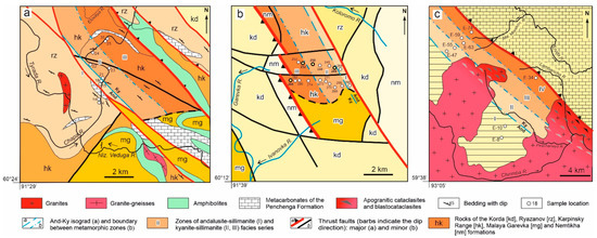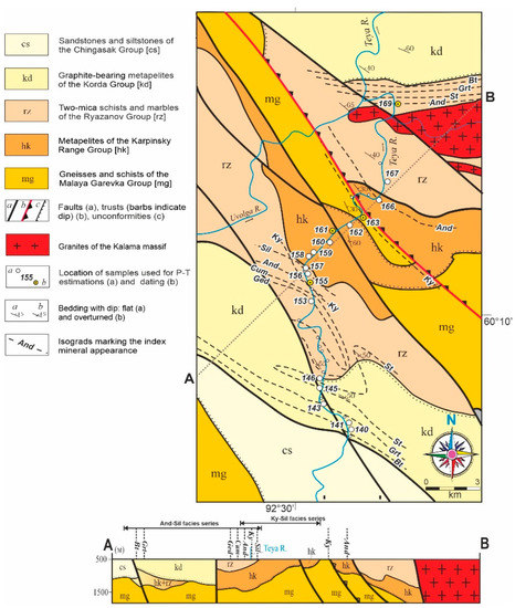 The study area of the Teya Complex is essentially composed of metamorphosed metacarbonate-terrigenous rocks of the Lower- and Middle-Proterozoic Teya, Sukhoy Pit, and Korda Groups intruded by c. 850–860 Ma calc-alkaline granites of the Kalama massif [72]. The emplacement of granitic intrusions produced an extensive thermal contact aureole, up to 1 km in width, with a distinct metamorphic zonation from chloritoid to sillimanite-K-feldspar zones, indicating that the conditions of metamorphism were along a high metamorphic field gradient with dT/dZ ≥ 100 °C/km [28]. The regional folded structure is complicated by faults of NW strikes attributed to the Uvolga fault zone in the northern sector of the Tatarka deep fault (Figure 1).