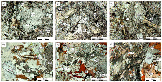 Photomicrographs showing the microtextural relationships among the Al2SiO5 polymorphs—andalusite, sillimanite, and kyanite—in the study areas of the Teya complex. Prograde sequences involve different reaction replacements: ((a,b)—Mayakon) And → Ky → Sil ± Fi; ((c)—Polkan) And → Ky → Sil; ((d)—Chapa) And → Sil → Ky; and ((e,f)—Teya) And → Sil → Ky + Fi.