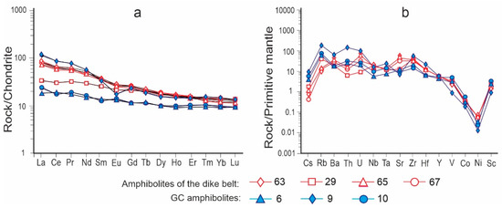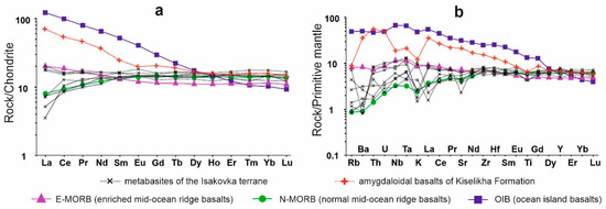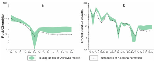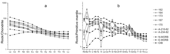 Major and trace element compositions were determined by XRF using a VRA-20R energy-dispersive spectrometer (Carl Zeiss, Jena, Germany) and by ICP-MS using a VG Element PQ2 (Finnigan Mat, Mainz, Germany) analyzer at the Analytical Center of the Sobolev Institute of Geology and Mineralogy (Novosibirsk) and at Common Use Center “Geoanalyst” of Zavaritsky Institute of Geology and Geochemistry (Ekaterinburg, Russia), following the procedures described elsewhere [76]. The detection limits were 0.02–0.005% for most major oxides. For MgO and Na2O, the detection limits were 0.05 and 0.1%, respectively. The detection limits of REE and HFSE were 0.005–0.1 ppm. The average accuracy was 2–7 rel.%.