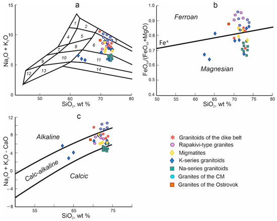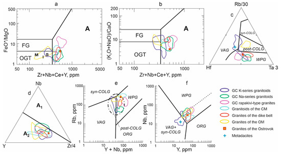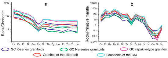 4. The Chernorechensky massif (CM) is located on the right side of the Yenisey River, in the Razgromnaya River basin (Figure 1), and is located in the same tectonic zone as the small massifs of rapakivi-type granites [66] (Figure 6b) and bimodal complex of granite and mafic dykes [5] (Figure 5). The intrusive body of a lens-like shape and an area of ~140 km2 occurs at large submeridional faults. Based on geophysical data, it is suggested that the massif has a subvertical dip, “plate-like” shape, and tectonic contacts with host rocks [67].