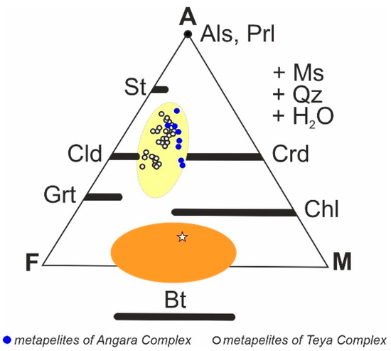 In all studied areas (Figure 11), rocks with “triple point” assemblages show similar sequences in the changes in the mineral assemblages in metamorphic zones produced at the same temperature, but the proportions of relict and newly formed minerals are different, as are the intensity of rock deformations. The mineralogical differences include the absence of cordierite (Chapa and Polkan areas) and the development of chloritoid (Polkan and Mayakon areas) at the lowest metamorphic grades. The occasional occurrence of rare mineral assemblages (Cld + Bt and Cld + Bt + And) and changes in the character of zoning in the metapelites of the And–Sil type in the Polkan and Mayakon areas may be explained by the Mn-bearing garnet being more stable at medium metamorphic grades [31].