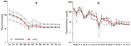 The total REE contents in metamorphic rocks have received comparatively little attention. For example, there is virtually no data on the distribution of REEs in Fe- and Al-rich pelitic schists, the metamorphism of which leads to the stability of rare mineral assemblages comprising chloritoid, Fe-cordierite, and other minerals, such as chloritoid + biotite, chloritoid + biotite + andalusite, and cordierite + garnet + muscovite [28,29]. The unusual bulk rock composition is interpreted to have been a distinction between typical metapelite and Fe- and Al-rich metapelite topologies in P–T diagrams [30,31]. In the literature, such a specific Fe- and Al-rich bulk rock composition is attributed to lateritic weathering processes [32]. However, full-profile lateritic weathering crusts are often absent in Precambrian sections [33], thus arousing interest in the origin of these rocks.